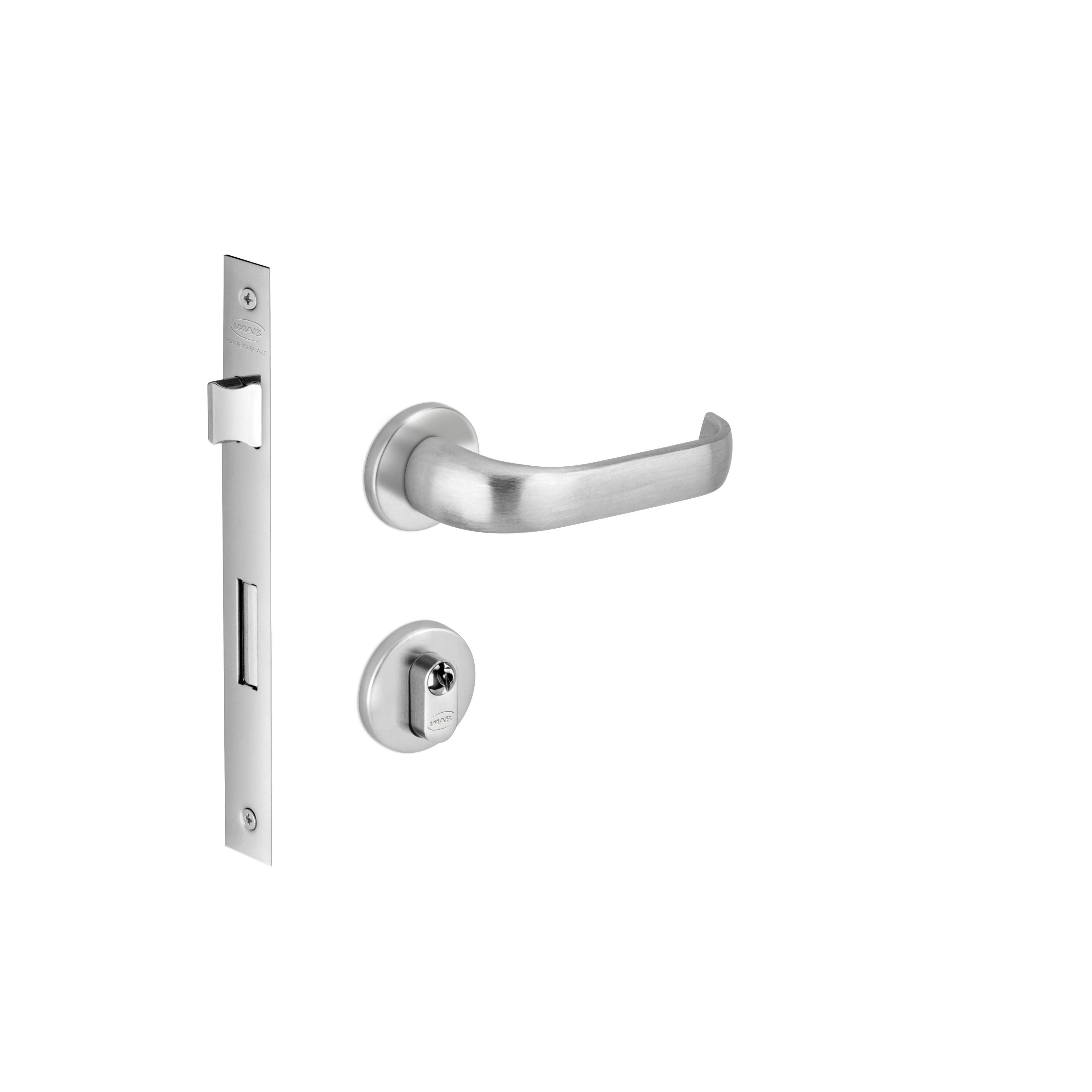 CONJUNTO DE FECHADURA DA LINHA PREMIUM DO MODELO DUNA MA0988 ,MATERIAL EM LATAO NO ACABAMENTO CROMO ACETINADO - CA , COMPOSTO DE ROSETA - 0066 EM LATAO , FECHADURA 1750 EXTERNA COM DISTÂNCIA BROCA 55 MM