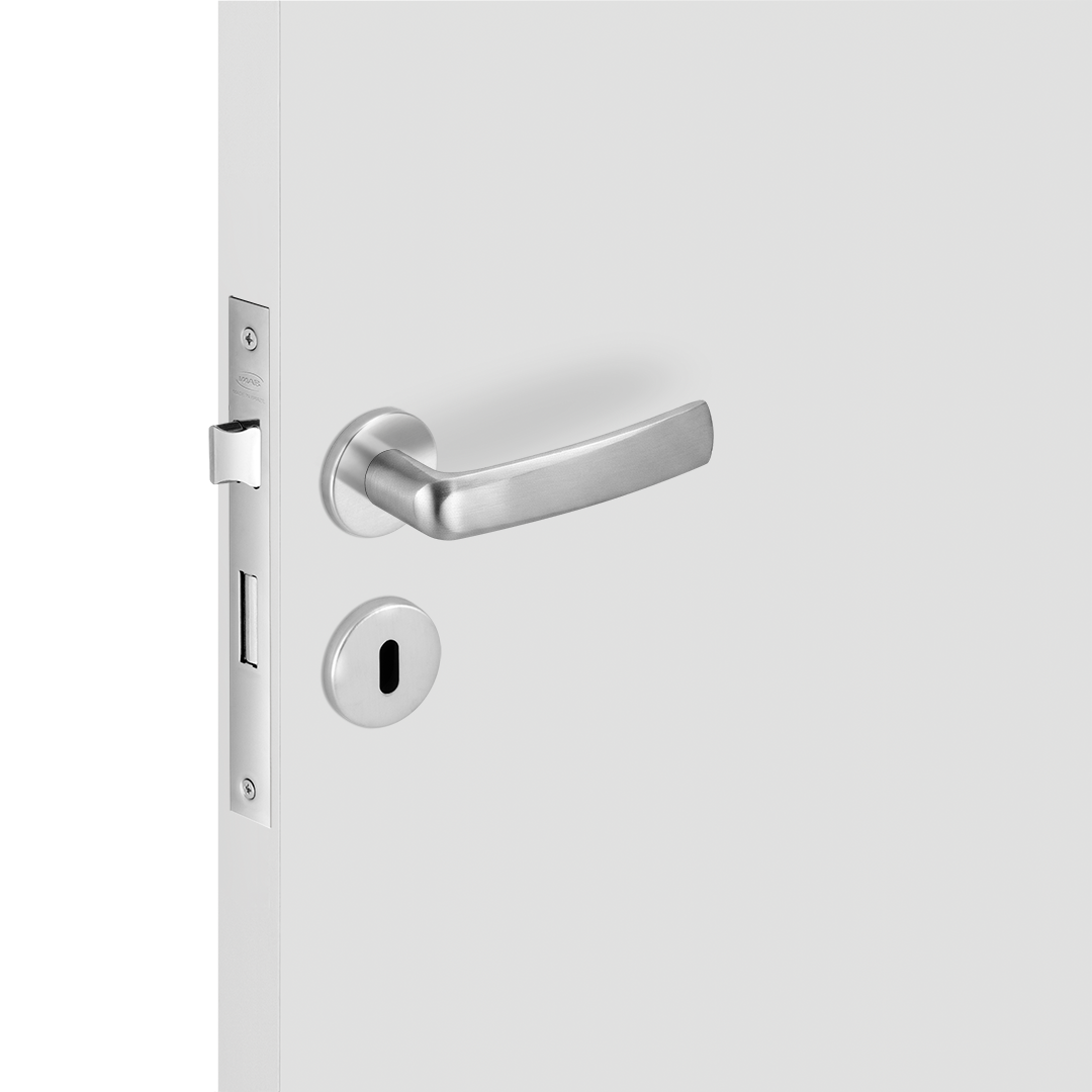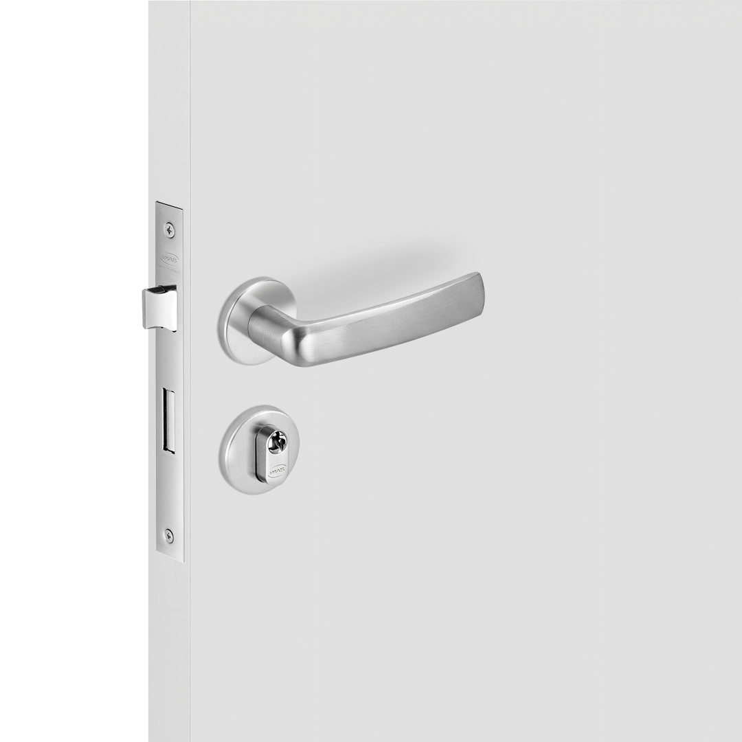 CONJUNTO DE FECHADURA DA LINHA BASIC DO MODELO POTI MA09B1 ,MATERIAL EM ZAMAK NO ACABAMENTO CROMO ACETINADO - CA , COMPOSTO DE ROSETA - 0069 EM ACO INOX , FECHADURA 1300 INTERNA COM DISTÂNCIA BROCA 40 MM TIPO I ,CLASSIFICADO CONFORME NORMA ABNT NBR 14913: 2- TRÁFEGO MÉDIO, 2- SEGURANÇA MÉDIA, 2- COM UMIDADES, SEM INTEMPÉRIES.